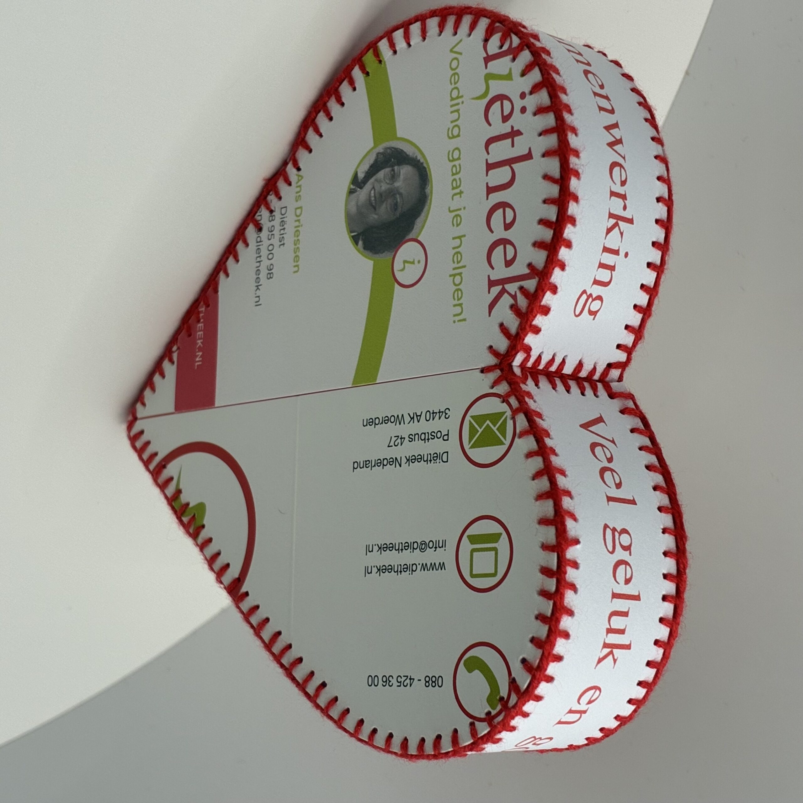 Persoonlijk handgemaakt hartje gemaakt van een trouwkaartje + witte standaard.
