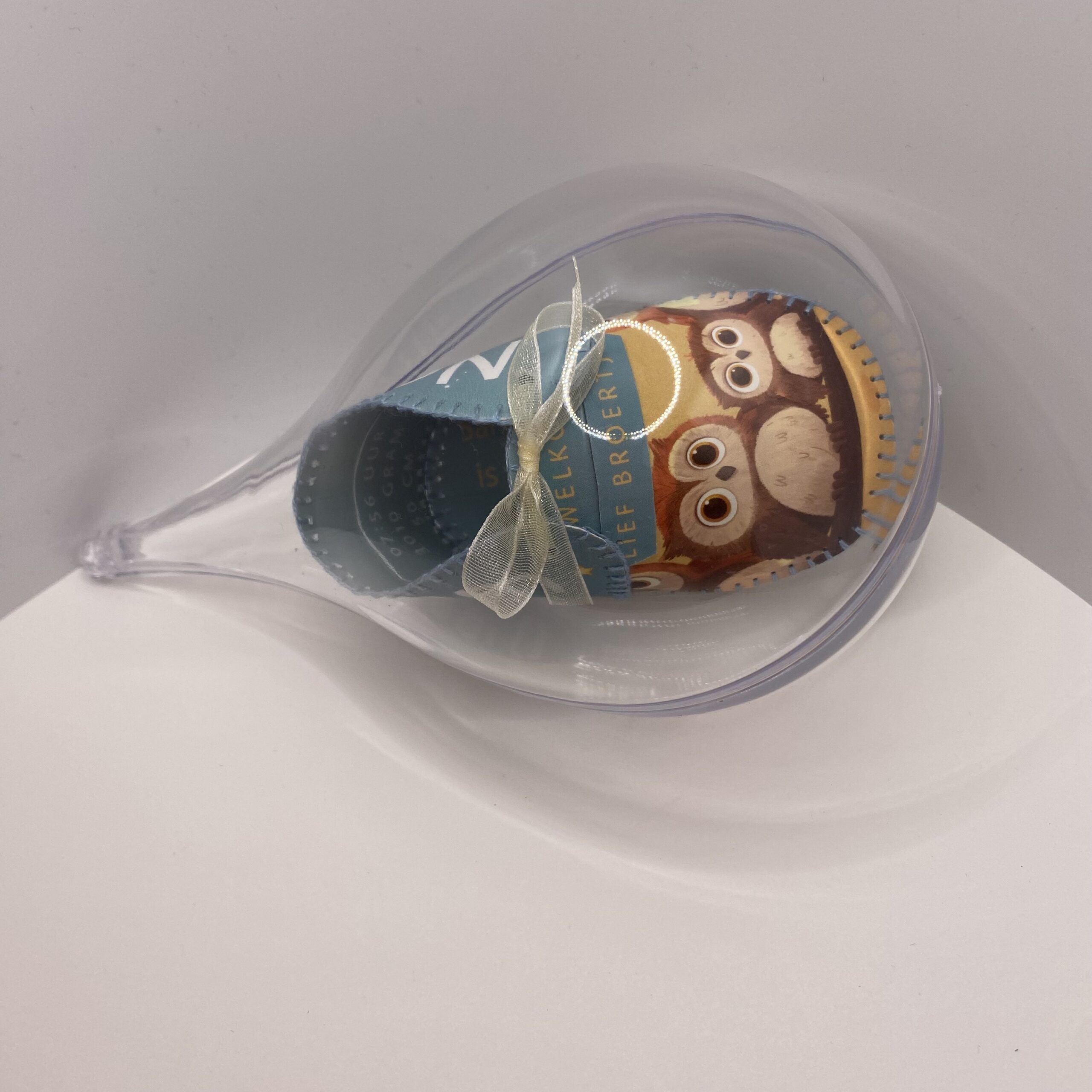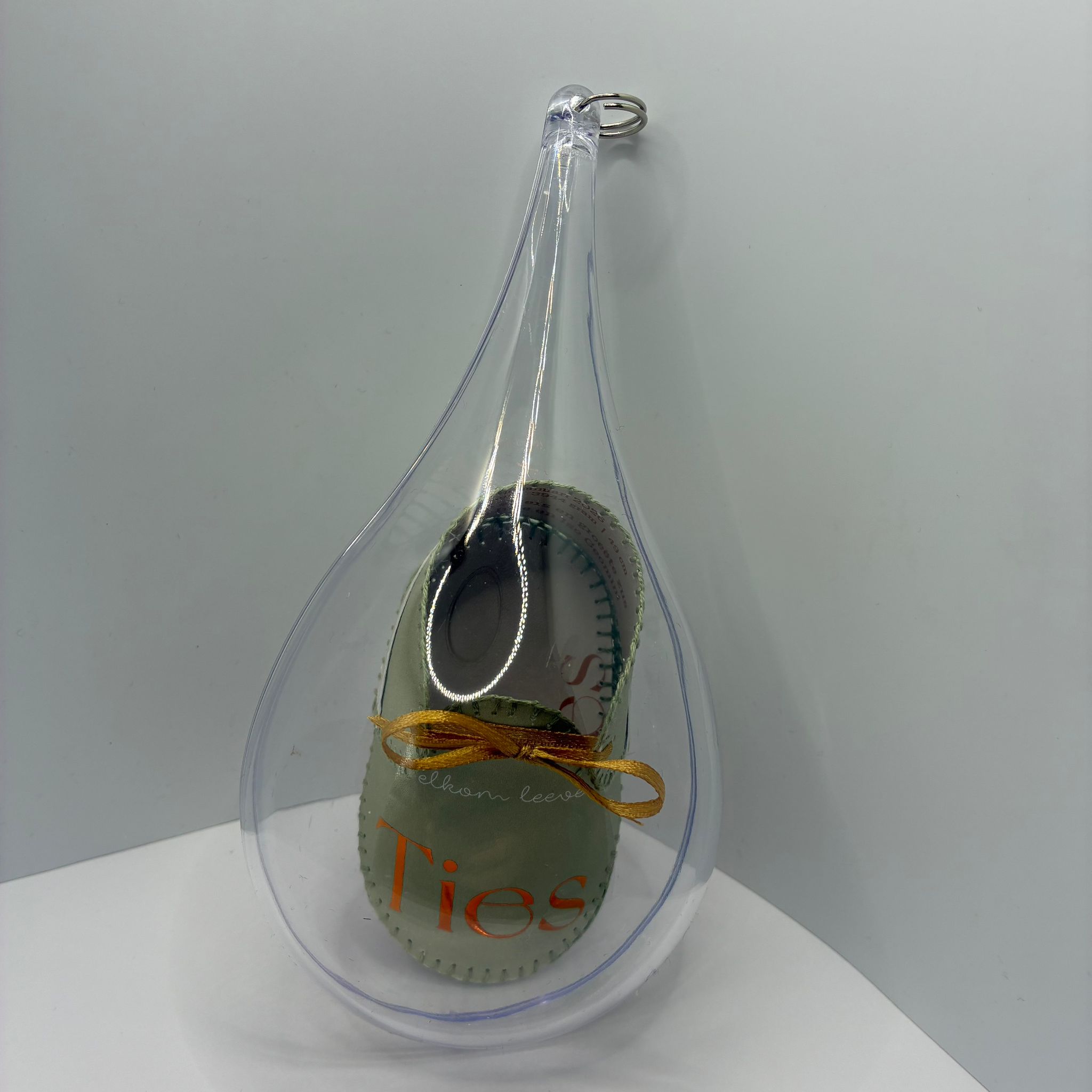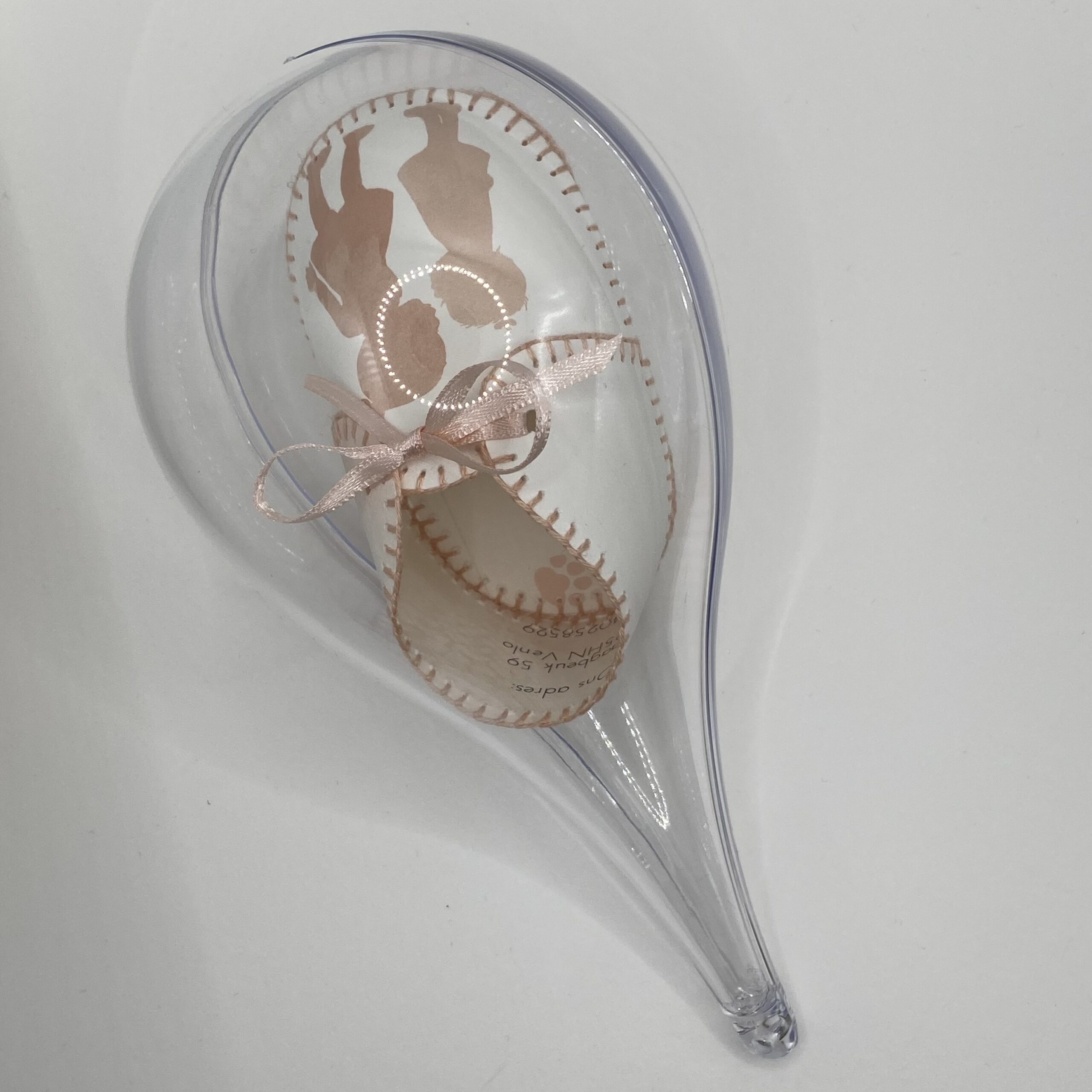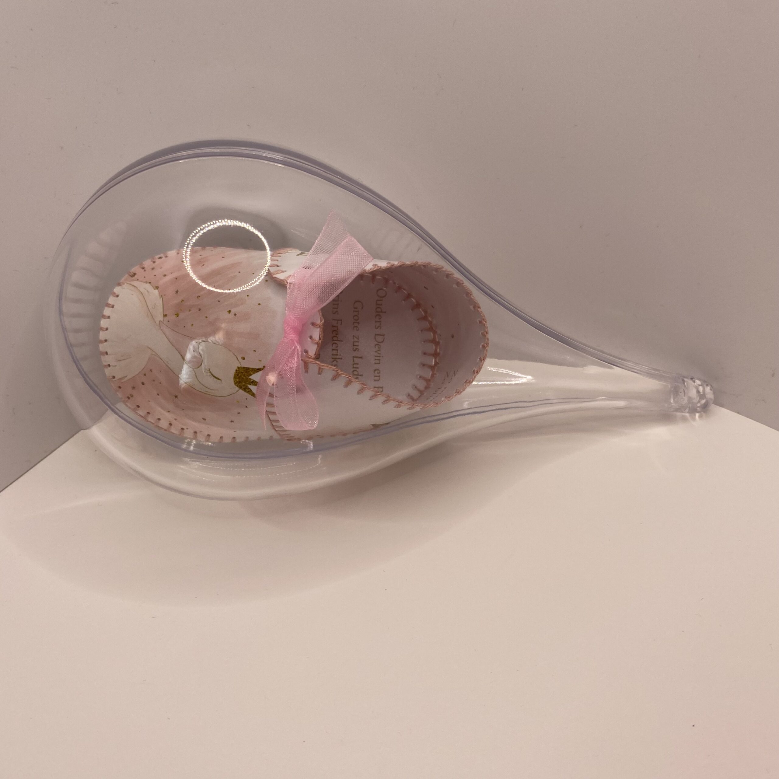 Het schoentje is verpakt in een druppel-vorm van glashelder plexiglas.