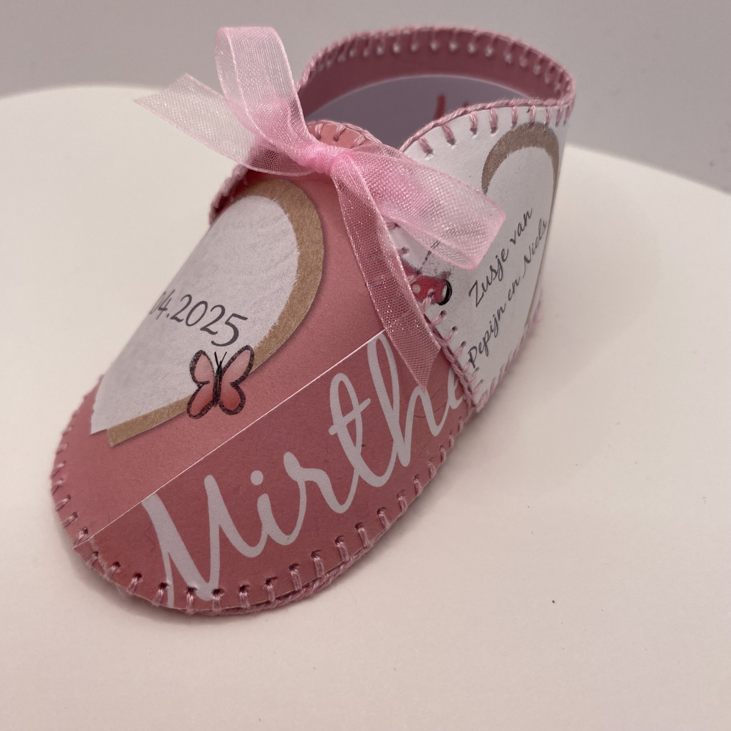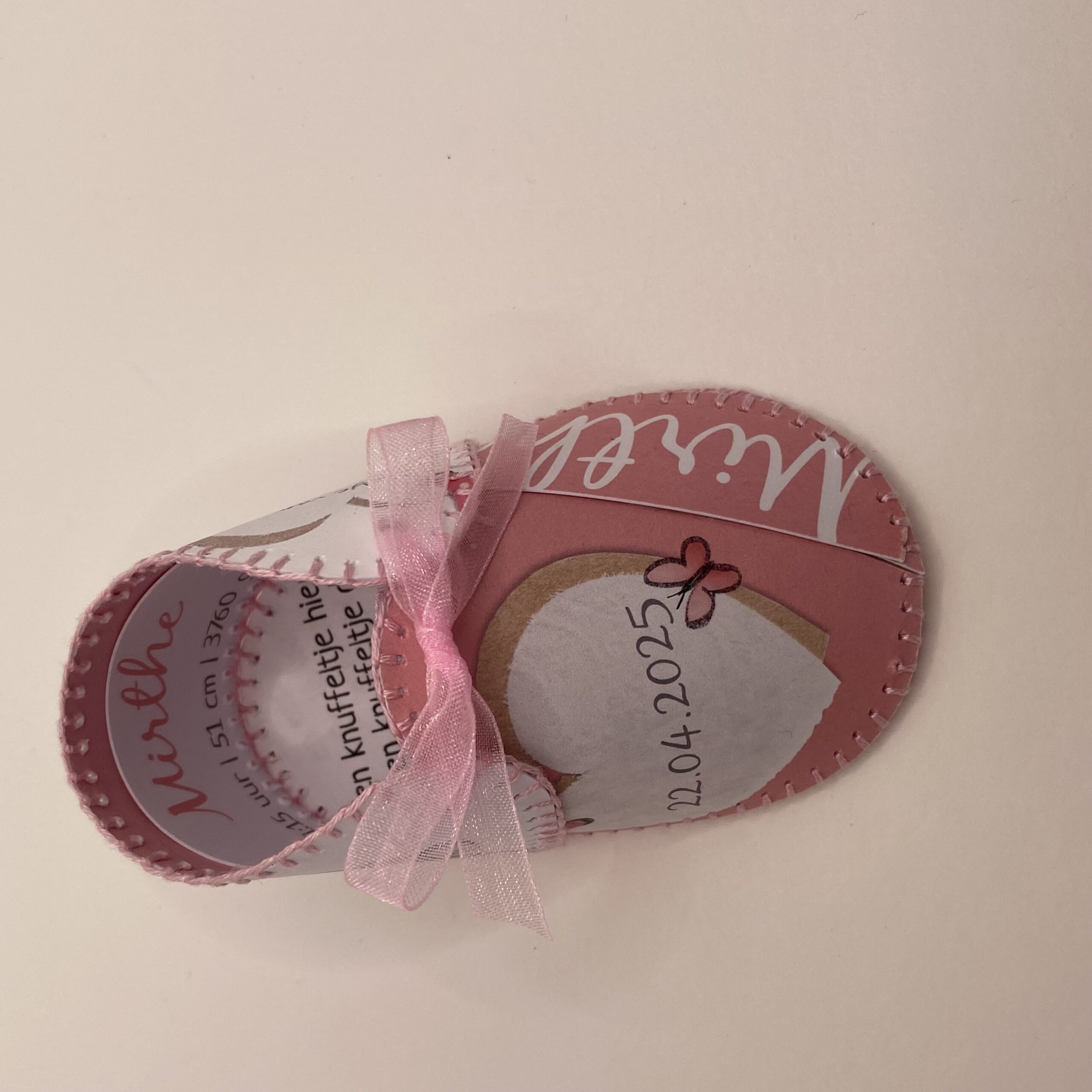 Persoonlijke handgemaakt schoentje, op creative wijze vervaardigd van uw orginele geboortekaartje.