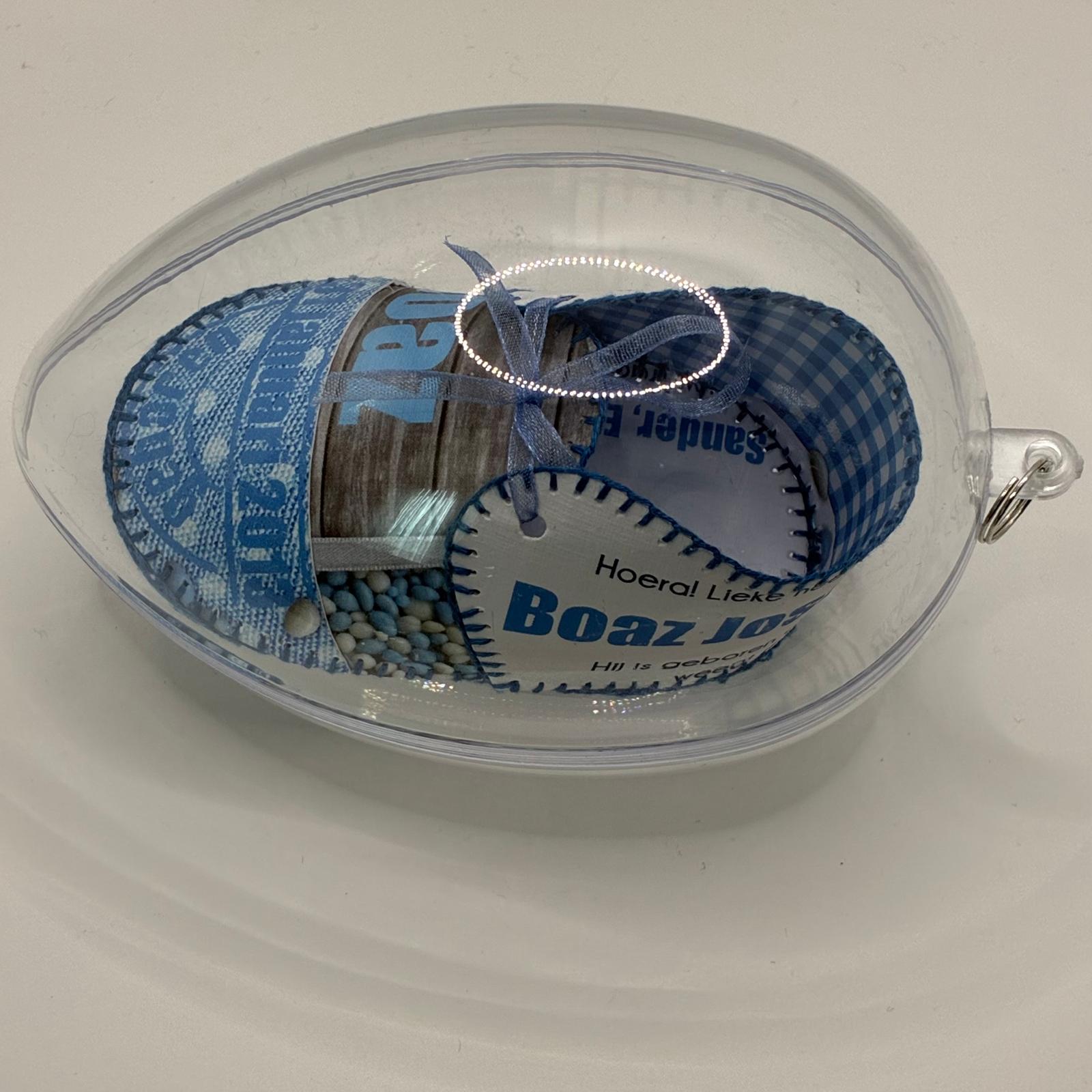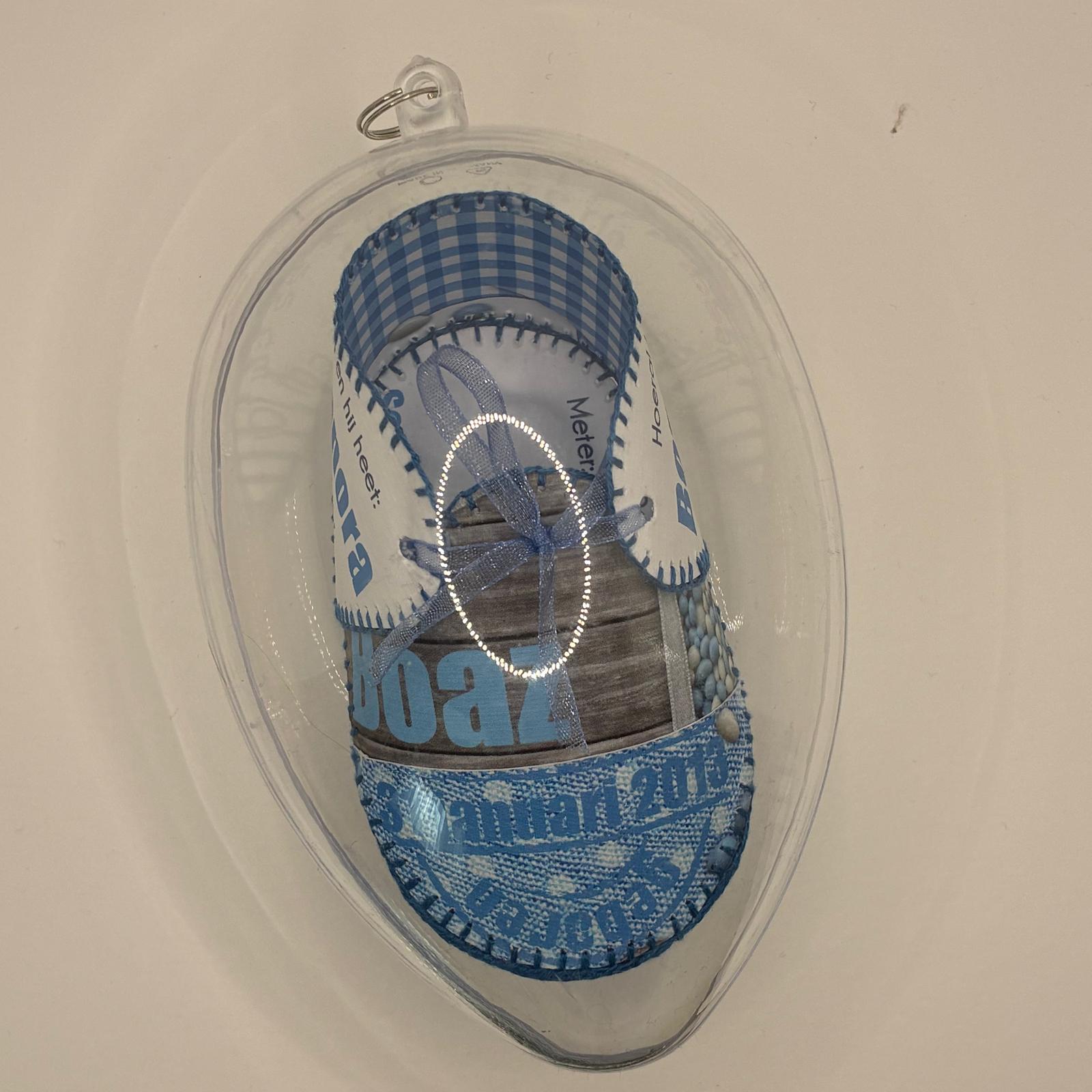 Persoonlijke handgemaakt schoentje, op creative wijze vervaardigd van uw orginele geboortekaartje.